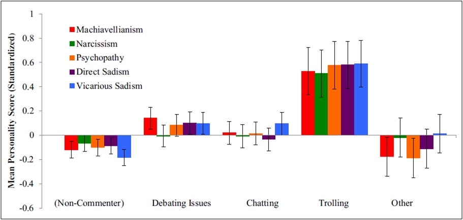 Es ist erkennbar, dass alle untersuchten Eigenschaften der dunklen Tetrade bei den Trollen stark ausgeprägt sind. Je mehr Zeit für das Trollen aufgewendet werde, desto stärker sei der Zusammenhang erkennbar. Ob trollen die Eigenschaften verstärkt, oder ob Menschen, die unabhängig vom Onlineverhalten sadistische Züge haben, diese Seite in einem für sie geschützten Bereich ausleben, ist noch nicht hinreichend erforscht.